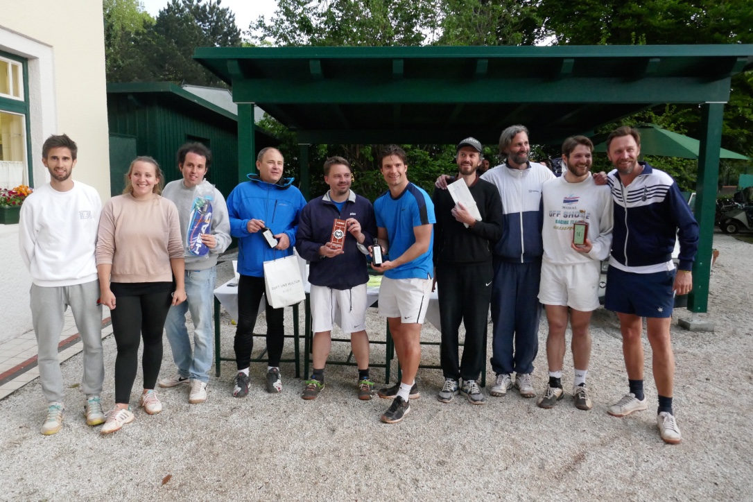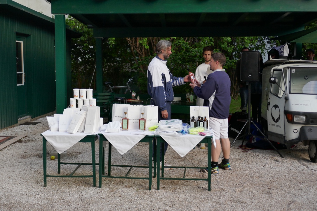 Das Tingel Tangel Tennis Turnier 2017 konnte nach der Absage im April nun im zweiten Anlauf am Sonntag, den 7. Mai, ausgetragen werden. Obwohl der Wetterbericht erneut nicht allzu rosig aussah, hätte das Wetter für die 64 Teilnehmer und rund 150 Zuschauer zum Turnierstart um 11 Uhr nicht besser sein können. Die Musik aus dem Tingel Tangel Mobil sorgte darüber hinaus für beste Stimmung unter den Anwesenden. Losgelegt wurde im Tiebreak-Tens Modus und auf allen Plätzen, schnell waren die ersten Runden absolviert. Als der A- und B-Bewerb im Semifinale ankam, sorgte das erste Sommergewitter der Saison dann für eine Stunde Wartezeit. Dank der Zusammenarbeit von Mitgliedern und Pächtern waren die Plätze aber in kürzester Zeit wieder bespielbar und auch die Sonne kehrte pünktlich zur Wiederaufnahme der Matches zurück. Im Finale des A-Bewerbs setzte sich schließlich Ali Kolaritsch vom WAT Ottakring gegen den Dornbiner Michael Grubhofer durch, im B-Bewerb besiegte Constantin Rhomberg das SVSB-Mitglied Bernadette Benedict. Zum Abschluss konnten die Sieger noch aus den vielen Preisen der Sponsoren HEAD Tennis, Saint Charles Apotheke, QWSTION, Comerc, meshit, Duft&Kultur und Kalê auswählen. Die vielen positiven Reaktionen der Spieler und Zuseher ermutigen dazu, das Format im kommenden Jahr wieder auszutragen...vielen Dank an alle, die dabei waren, bis zum nächsten Mal!